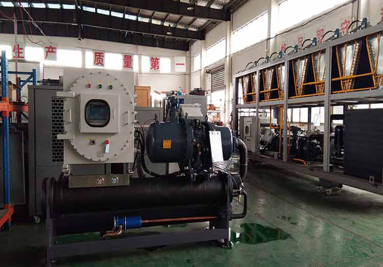 給反應釜冷卻、控溫的制冷設備——反應釜控溫低溫機組,多選用防爆型機組或低溫防爆型機組。用于化工反應釜(化工換熱器)的降溫冷卻,及時帶走因化學反應而產生的巨大熱量從而達到降溫(冷卻)的目的,用以提高產品質量。